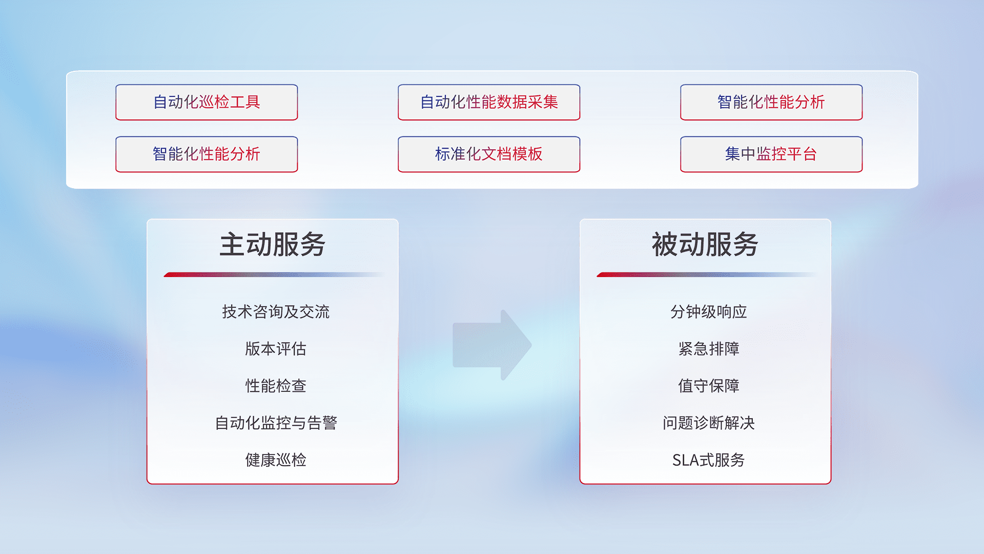 智能化工具和标准化文档,,保障服务质量,,,,提供主动服务(包含技术咨询、、版本评估、、性能检查、、、、自动化监控与告警、、、健康巡检)和被动服务包含(分钟级响应、、紧急排障、、值守保障、、问题诊断解决、、、SLA服务)。。